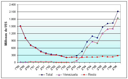 Tal como se puede apreciar, Venezuela tiene un importante peso en el total de débitos, el cual además, evolucionó de forma creciente. En efecto, su participación en el total fue del 82,8% en el segundo cuatrimestre de 2005, pasando al 86,1% y 87,1% en el primer y segundo cuatrimestre de 2006, respectivamente.