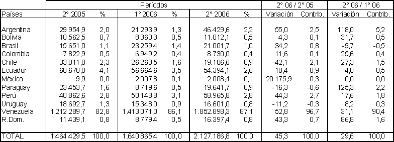 En tal sentido, al considerar las variaciones respecto a igual cuatrimestre de 2005, se destacan los incrementos de México (20.175,9%), Argentina (55%), Venezuela (52,8%), Perú (44,3%) y República Dominicana (43,3%), mientras que las reducciones corresponden a Chile (-42,1%), Paraguay (-16,3%) y Uruguay (-11,2%). Por su parte, al medir los cambios respecto al período inmediato anterior (primer cuatrimestre de 2006), entre los de signo positivo sobresalen los correspondientes a Paraguay (125,3%), Argentina (118%) y República Dominicana (86,8%), mientras que los comportamientos negativos pertenecen a Chile (-27,3%), Brasil (-9,7%) y Ecuador (-4%).