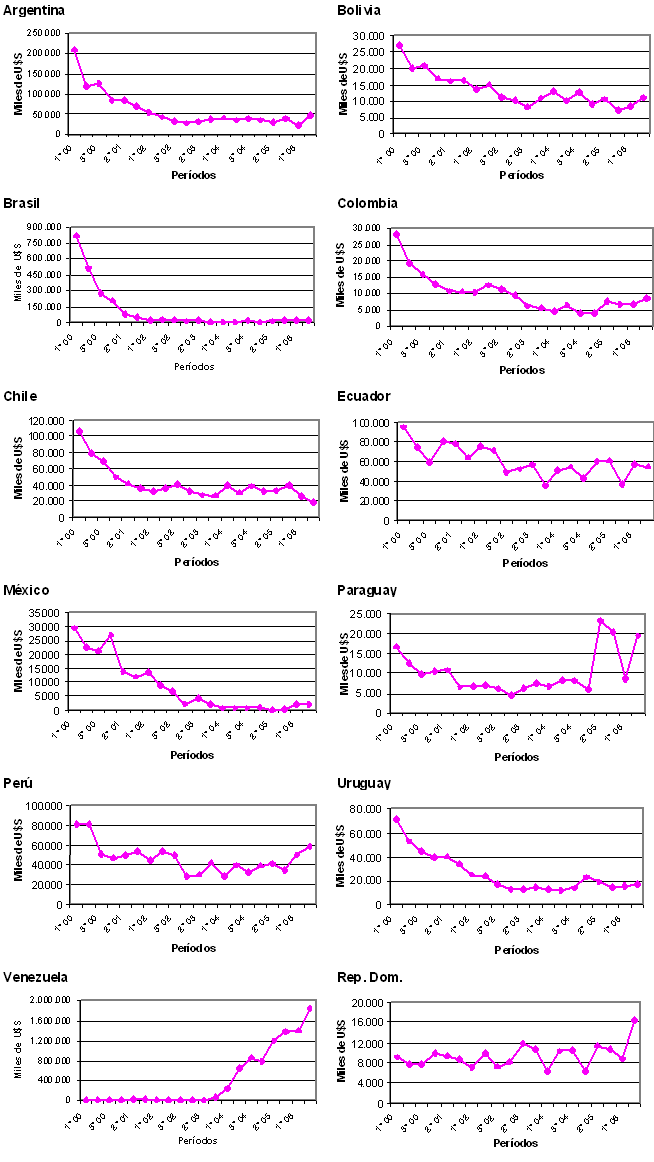 Observando la evolución como se presenta en los gráficos de los débitos por país, cabe indicar que a las variaciones positivas de Venezuela ya citadas, se suman los comportamientos de igual tendencia por parte de República Dominicana y de Paraguay. A su vez, Perú, si bien registra una recuperación en los valores de los dos últimos cuatrimestres, los mismos aún resultan inferiores a los del comienzo de la serie presentada. Los restantes miembros, por su parte, muestran un comportamiento descendente, aunque en la mayoría de los casos dichas reducciones parecen haber alcanzado un piso en el cual se mantienen, con algunas oscilaciones.