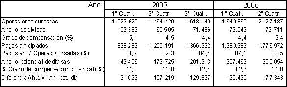 El Convenio de Pagos y Créditos Recíprocos registró operaciones por un total de 2.127 millones de dólares en el segundo cuatrimestre de 2006, representando un aumento del 45,3% respecto a igual período de 2005 y del 29,6% con relación al primer cuatrimestre del año en curso. Sin embargo, el grado de compensación multilateral descendió para ubicarse en el 3,4%.