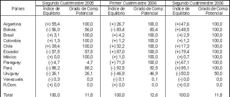 Como puede apreciarse en el cuadro de referencia, el desequilibrio que caracteriza la actual operativa del Convenio de Pagos se mantiene respecto a igual cuatrimestre del año anterior, mostrando un leve incremento respecto al primer cuatrimestre de 2006, con una reducción del grado de compensación potencial global del 12,6% al 11,8%. A nivel de países esta situación se refleja en que tanto el principal deudor, Venezuela, como los principales acreedores -Colombia, Brasil y México-, presentan muy bajos niveles en sus índices de equilibrio.
