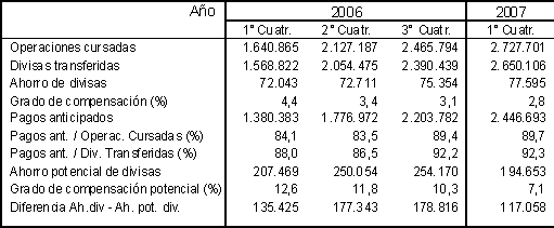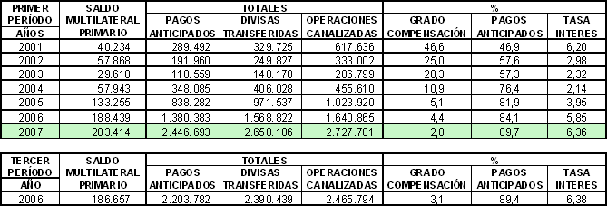 Para ello, en el cuadro siguiente se exponen los datos correspondientes a los saldos multilaterales primarios, pagos anticipados, divisas transferidas, operaciones canalizadas, grado de compensación y tasas de interés registrados en los primeros períodos desde 2001, así como los del tercer cuatrimestre de 2006.