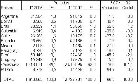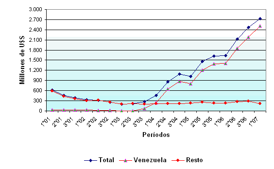 Como también se puede apreciar, los débitos concernientes a Venezuela experimentaron un incremento del 78% respecto a igual período de 2006, dando cuenta de la variación de los valores de los débitos globales en el período analizado en su casi totalidad, siendo además su contribución al incremento global del 101,4%, y compensando en parte las reducciones experimentadas por los débitos de otros países.