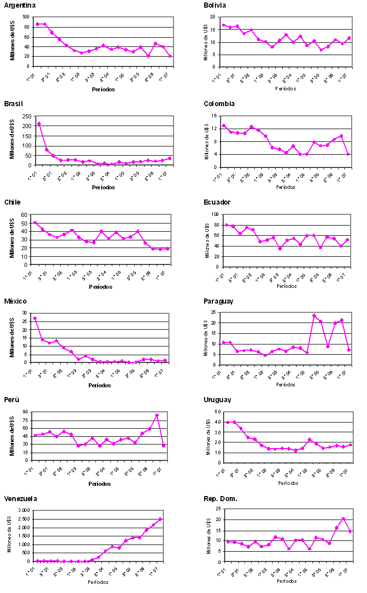 En cuanto a la evolución de los débitos por país, tal como se presenta en los siguientes gráficos, cabe destacar que la mayoría de los mismos muestra un comportamiento con tendencia descendente. No obstante, en muchos de estos casos el nivel de los débitos, luego de las pronunciadas reducciones de comienzo de la serie, parece haber alcanzado un piso en el cual se mantienen con oscilaciones.