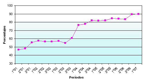 Esta situación refleja el uso de las transferencias anticipadas como medio de reducción de los costos financieros asociados al Convenio, tal como ha venido sucediendo en los últimos años. Al respecto, cabe señalar la evolución observada, la cual estuvo en un nivel aproximado al 50% hasta el 2003, para posteriormente registrar una tendencia positiva que lo ubica, en la actualidad, en el 90%. Cabe agregar que estos resultados, se relacionan con el fuerte crecimiento de las operaciones de Venezuela y el correspondiente incremento de sus transferencias anticipadas.