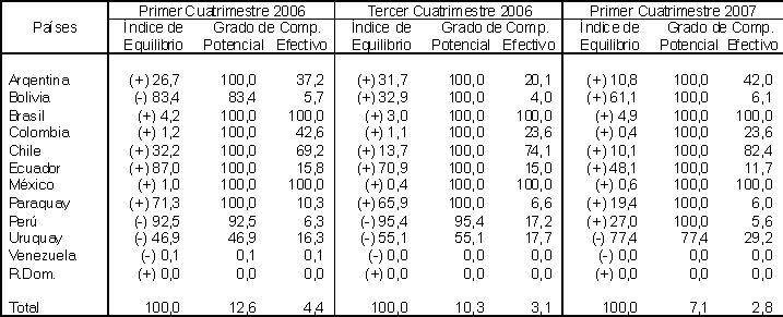 A nivel de países, el fuerte desequilibrio global se refleja en los muy bajos valores que registraron los índices de equilibrio correspondientes a Venezuela (único deudor) y principales acreedores (República Dominicana: 0,0; Colombia: 0,4; Brasil: 4,9; y México: 0,6).