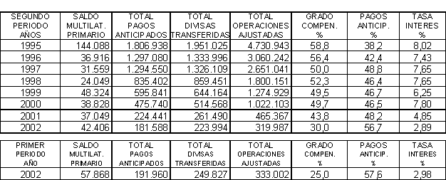 Durante el segundo cuatrimestre del año 2002 (Mayo - Agosto), la liquidación global de saldos de la Compensación Multilateral (suma de los saldos multilaterales de los bancos centrales con posición deudora y recíprocamente de aquellos con posición acreedora), arrojó un valor de U$S 42.405.914,99 (Cuadro 1, Anexo I).