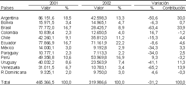 Al igual que en el primer cuatrimestre del año, los socios del MERCOSUR explican una parte significativa de la reducción global de los débitos (un 78%), aunque en este período con una incidencia más similar entre Brasil y Argentina. En el primer caso, la disminución de sus débitos explica por si sola una tercera parte de la caída global. Los débitos brasileños disminuyen en forma pronunciada desde todas las contrapartes, con la única excepción, aunque marginal, por su magnitud de Perú, siendo la más importante, dada su participación, la caída de los débitos desde Chile. En el caso de Argentina, la reducción de sus débitos explica un 30% de la caída global, siendo fundamentalmente originada en los débitos desde Brasil, aunque también se reducen en forma importante aquellos originados en los restantes socios del MERCOSUR y Chile. Finalmente, también es relevante la incidencia de Venezuela, cuya reducción en los débitos de cuenta de un 13% de la caída global.